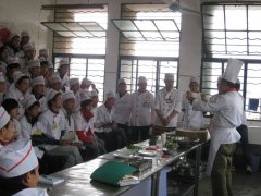 为丰富学生学习生活,开拓视野,丰富知识,加强校企合作与交流, 3月25日下午,烹饪事业部邀请广西南宁银河大酒店(三星级)厨师长陈建桥大师到我校为2011级新生上公开实训课。 在实操楼四楼教室,笔者看到教学课堂